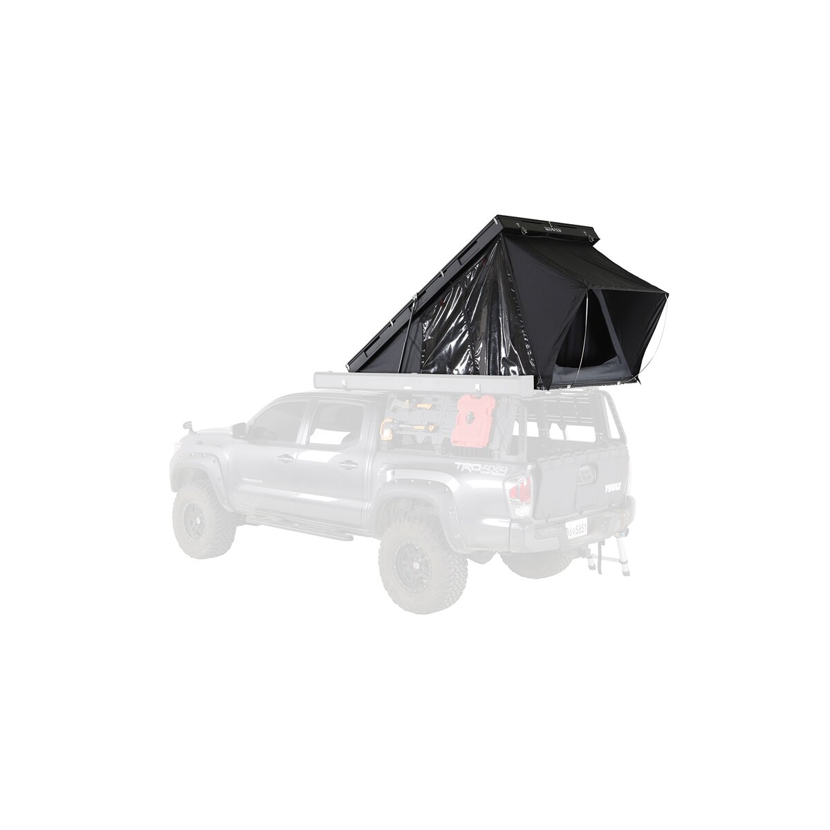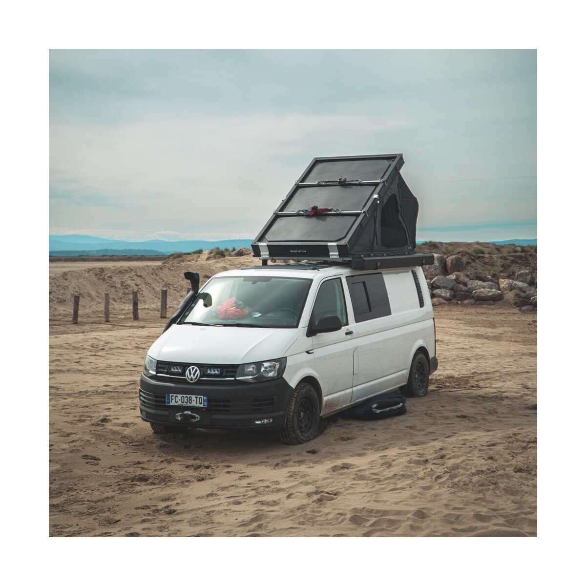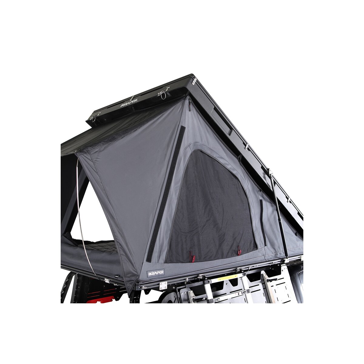 Moreover, the BDV is super flat. When closed, it is only 17 cm high. And unfolding the tent is just as easy and quick as you'd expect. Once both snap fasteners on the hard shell are open, a gentle pressure against the tent cover is enough, and the tent opens automatically in 15 seconds. Then just install the ladder and the door tension rod, and the tent is ready for occupancy.