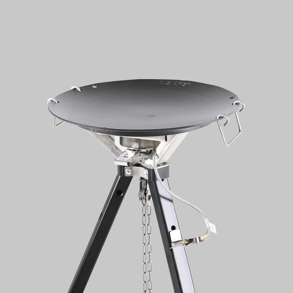 Mit der Disco Serie kannst du aber nicht nur nicht nur über dem Gaskocher, sondern auch über einem Lagerfeuer kochen: Einfach das Dreibein über das Feuer oder die heiße Glut stellen, und einen Dutch Oven, ein Grillrost oder die Disco-Pfanne an die mitgelieferte Kette hängen.